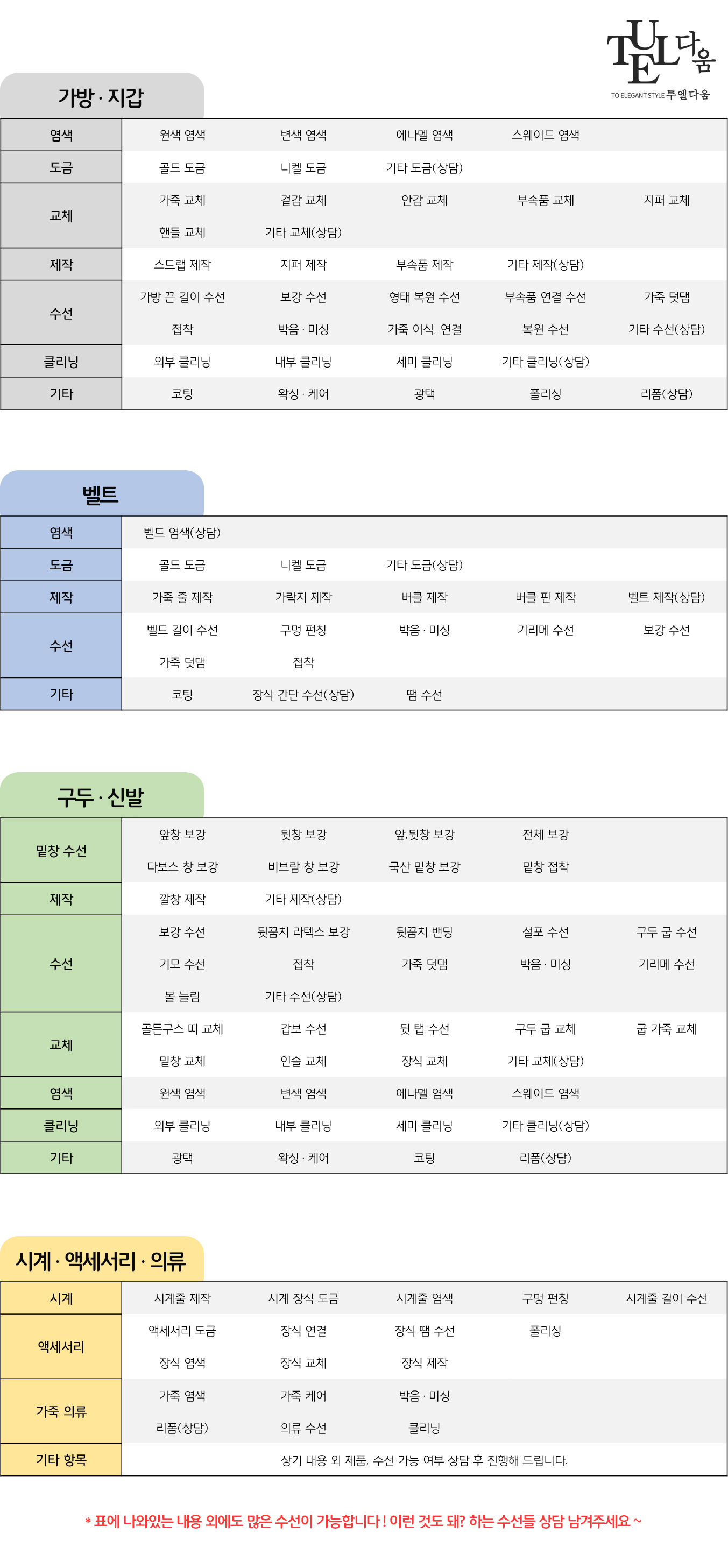 º§Æ®, Áö°©, ¾×¼¼¼¸®´Â Á¦Ç°ÀÇ ¼ÒÀç¿Í Ư¼º¿¡ ¸Â°Ô ¼ö¼±ÀÌ ÁøÇàµÇ¸ç °¢ Ç׸ñº°·Î ¿°»ö, °¡Á×±³Ã¼, º¸° µî ´Ù¾çÇÑ ¼ö¼±ÀÌ °¡´ÉÇϸç Ä÷¸®Æ¼ ³ôÀº µµ±ÝÀ» ÅëÇØ ¿ø·¡ÀÇ ¸ð½ÀÀ» À¯ÁöÇÏ´Â °Í¿¡ ÁÖ¾ÈÁ¡À» µÎ°í ÀÖ½À´Ï´Ù.